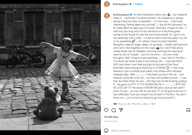Spears went on to explain that she “had been crying in the car … but nobody could tell,” only herself, and a random man told her it was going to be okay. “He doesn’t KNOW ME and I sure as hell didn’t know his [expletive]… so why did he say that ??? It’s all gonna be ok !!! I was offended.”