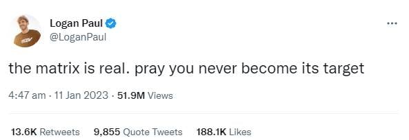 On January 10, the social media influencer tweeted, “The Matrix is real. Pray you never become its target.”