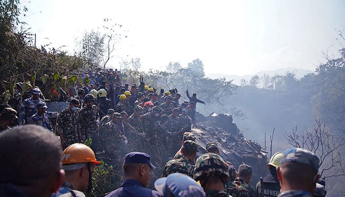 POKHARA: Nepali rescue workers scoured a debris-strewn ravine Monday for more bodies from the mangled wreckage of a plane with 72 people on board, with hopes of any survivors now "nil", according to officials.