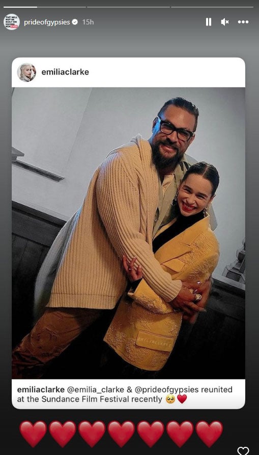 A fan account of Clarke shares the post and Momoa reshared the onto his stories with a bunch of heart emojis, not before commenting on the original post, “love you mama [four heart emojis]”