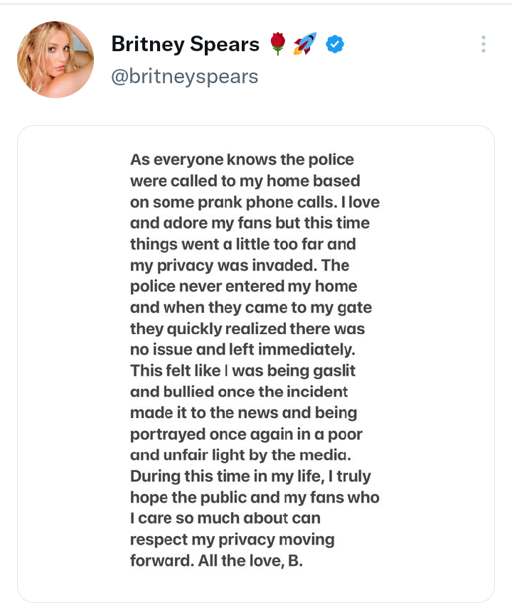 Britney Spears issues statement after prank phone calls leads to police visit