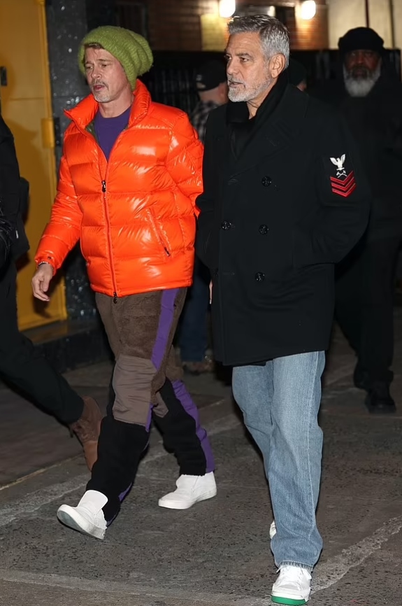 Brad Pitt steps out in bright orange coat alongside George Clooney in NYC