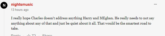 Another fan commented, “I really hope Charles doesn't address anything Harry and Meghan. He really needs to not say anything about any of that and just be quiet about it all. That would be the smartest road to take.”