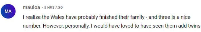 “I realize the Wales have probably finished their family - and three is a nice number. However, personally, I would have loved to have seen them add twins,” commented another well-wisher.