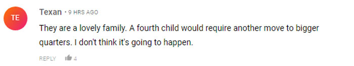 Another said, “They are a lovely family. A fourth child would require another move to bigger quarters. I don't think it's going to happen.”