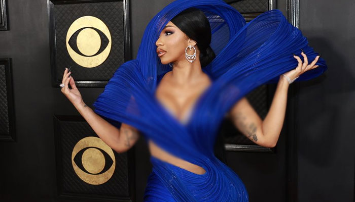 The Bodak Yellow rapper’s heads-turning look wasn’t her first sculptural outfit of the night, she first appeared to the Grammys 2023 red carpet in a electric blue gown by India's designer Gaurav Gupta Couture.