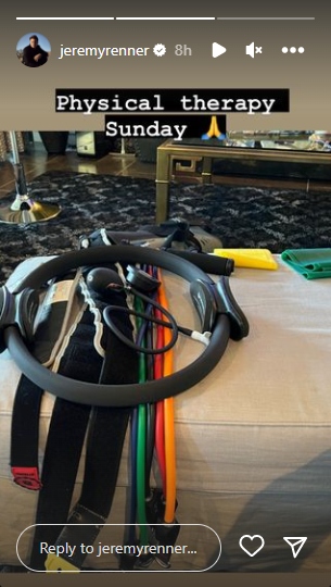 Renner shared the image of resistance bands with the caption, “Physical therapy Sunday” and added a folded hands emoticon.