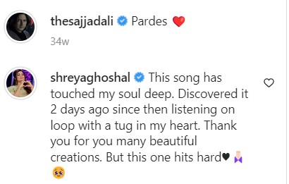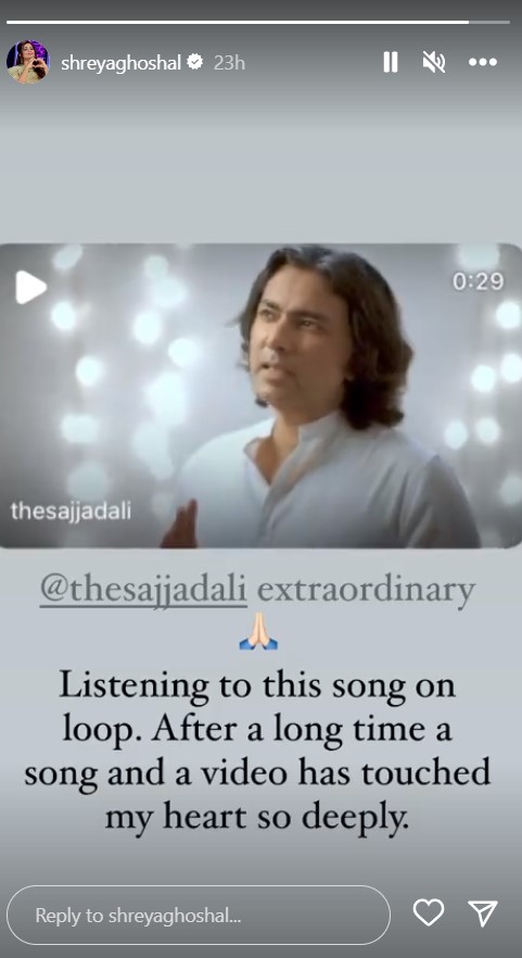 Taking it to her Instagram story, she shared his song and wrote: “@thesajjadali extraordinary. Listening to this song on loop. After a long time a song and a video has touched my heart so deeply.”