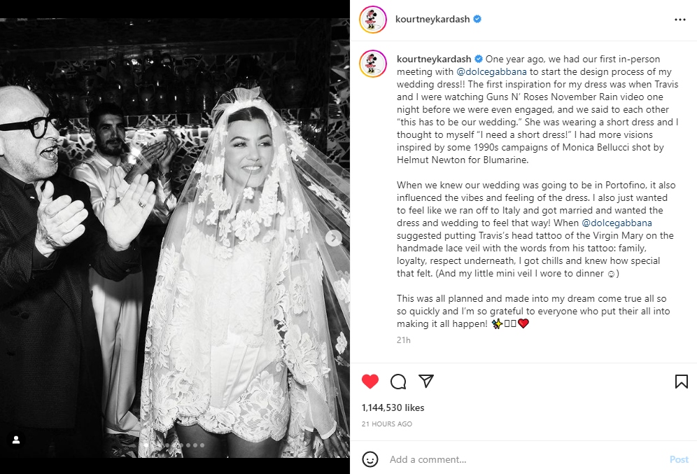 “When @dolcegabbana suggested putting Travis’s head tattoo of the Virgin Mary on the handmade lace veil with the words from his tattoo: family, loyalty, respect underneath, I got chills and knew how special that felt,” she revealed.