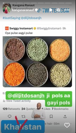 Kangana took to her Twitter and Instagram and reshared a post by Swiggy India. It showed a number of pulses with a caption ‘pulse aagai pulse’. She tagged Diljit on her tweet and wrote, ‘Just saying!’ Sharing the same post on her Instagram stories, she wrote, ‘Diljit Dosanjh ji pols aagai pols.’