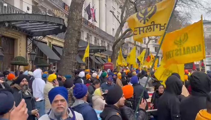 LONDON: Thousands of British Sikhs demonstrated outside Indian High Commission against the Indian government crackdown in Indian Punjab for the arrest of Khalistani Amritpal Singh and the illegal detention of thousands of pro-Khalistan Sikhs across Punjab in fake cases — following a huge turnout of Sikhs for Khalistan Referendum in two cities of Australia over the last two months.