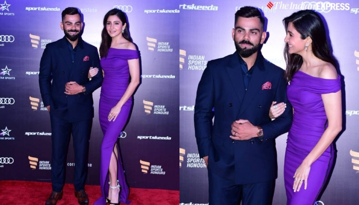 Anushka Sharma poses in purple gown with hubby Virat Kohli