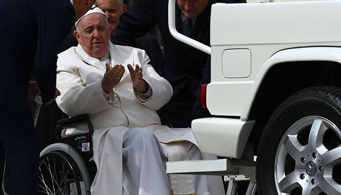 The pope, who this month marked 10 years as head of the Catholic Church, had earlier appeared in good spirits at his weekly audience at the Vatican, smiling as he greeted the faithful from his "popemobile".