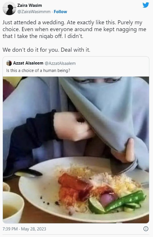 In response, Zaira wrote: “Just attended a wedding. Ate exactly like this. Purely my choice. Even when everyone around me kept nagging me that I take the niqab off. I didn’t.”