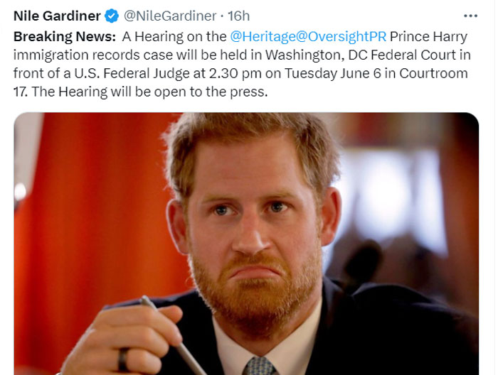 Nile Gardiner, director of the Margaret Thatcher Centre for Freedom at the Heritage Foundation, tweeted, “Breaking News: A Hearing on the @Heritage @OversightPR Prince Harry immigration records case will be held in Washington, DC Federal Court in front of a U.S. Federal Judge at 2.30 pm on Tuesday June 6 in Courtroom 17.