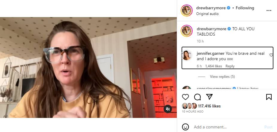 Jennifer Garner praised Drew for speaking out against the tabloids, adding, “You are brave and real and I adore you.”