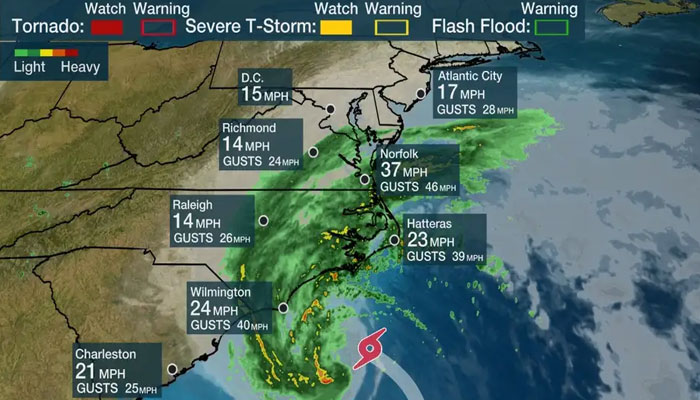The heavy rainfall and gusty winds are set to worsen throughout Friday evening and into the night as the storm edges closer to the coast, prompting tropical storm warnings spanning from just south of Charleston, South Carolina, to the Maryland-Delaware state line. Storm surge watches and warnings extend from Surf City, North Carolina, to the Chesapeake Bay.