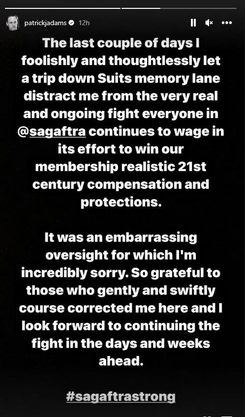 The actor said, “The last couple of days I foolishly and thoughtlessly let a trip down Suits memory lane distract me from the very real and ongoing fight everyone in @sagaftra continues to wage in its effort to win our membership realistic 21st century compensation and protections.”