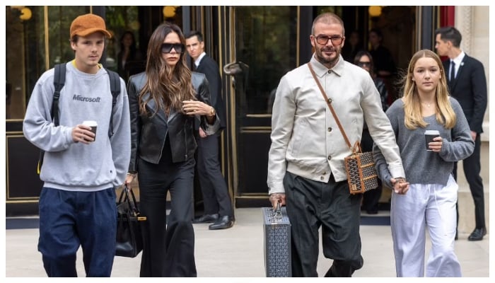 David, holding Harper's hand, exuded style in a beige jacket and loose-fitting trousers. The athlete carried a Goyard trunk bag and a matching document case, shielding his eyes with aviator sunglasses.