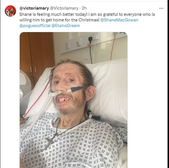 Shane's wife Victoria Mary Clarke took to X, formerly known as Twitter, to thank the musician's for paying a visit alongside a harrow photo of her husband now using a breathing apparatus as he continues to battle the dangerous condition.