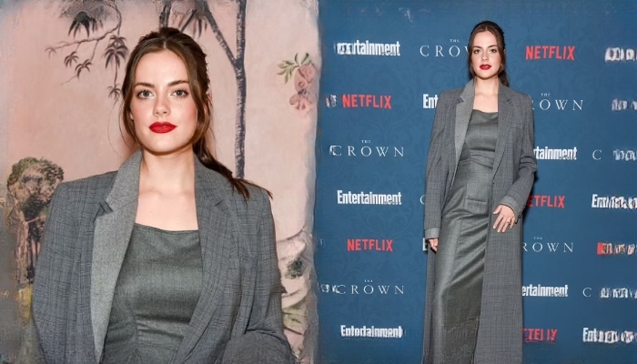 The 21-year-old actress, set to play the Princess of Wales in the upcoming Netflix series episodes, showcased her style in a grey dress and long blazer.