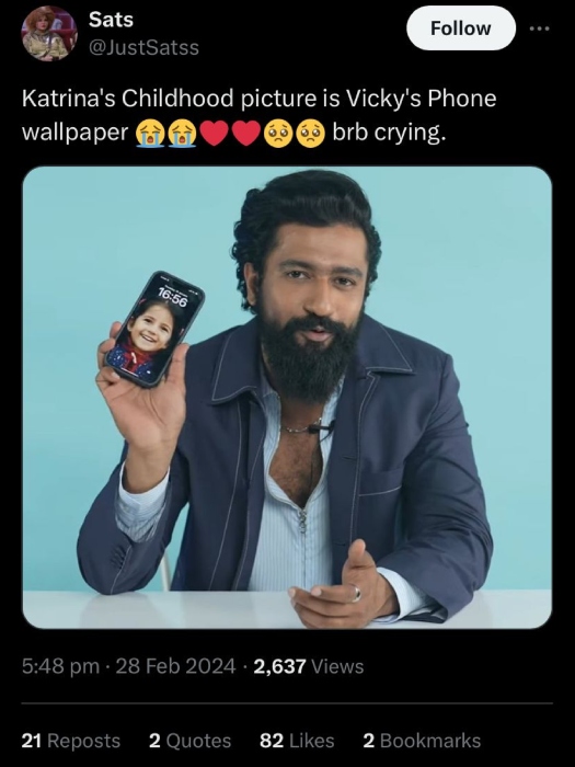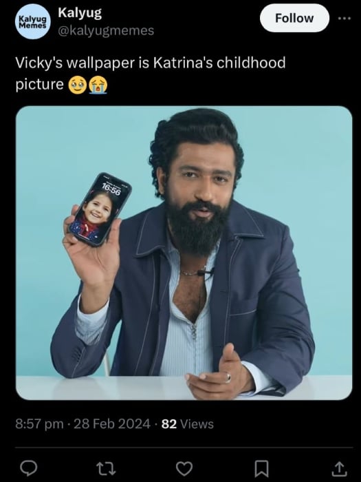 During a fashion magazine interview for the GQ segment Things Vicky Kaushal Can’t Live Without, the 35-year-old actor surprised everyone by briefly flashing his adorable phone wallpaper, which featured a childhood snapshot of Katrina smiling with two ponytails.