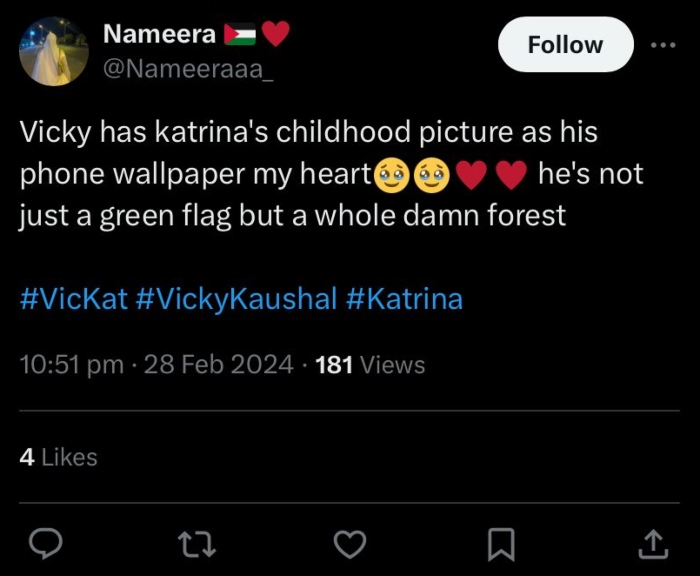While others hailed Vicky as a "green flag." stating, "Vicky has Katrina's childhood picture as his phone wallpaper he's not just a green flag but a whole damn forest."