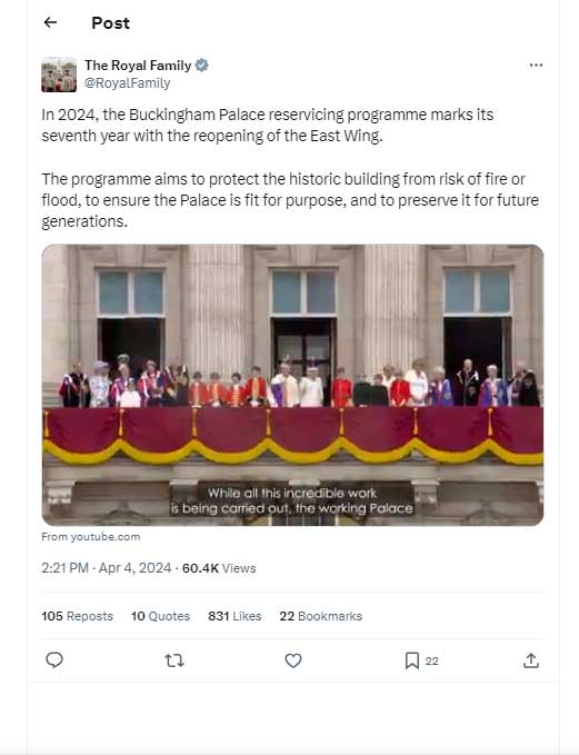 The video was captioned: "The programme aims to protect the historic building from risk of fire or flood, to ensure the Palace is fit for purpose, and to preserve it for future generations.