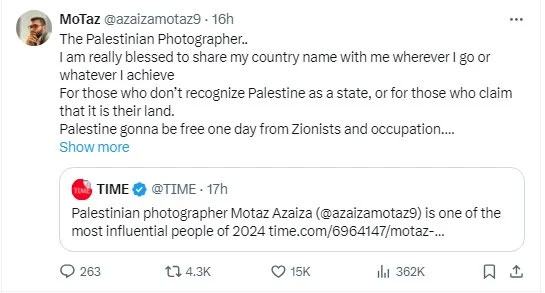 World renowned Time Magazine has named Palestinian photographer Motaz Azaiza among the "‘The 100 Most Influential People Of 2024" for his selfless service in covering the ongoing war in Gaza.