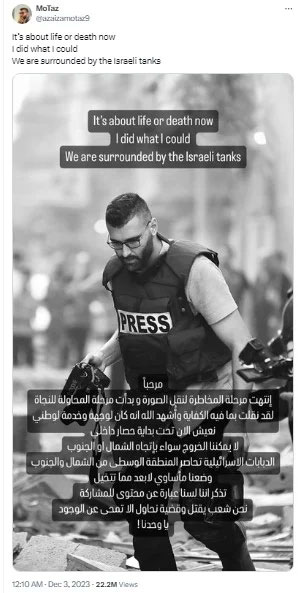 The journalist has been actively vocal about the catastrophic consequences of Israel's onslaught on Gaza and has time again expressed concern for his own life due to Israeli forces' aggressive tactics in the beleaguered territory.