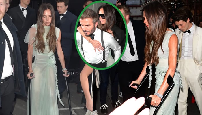Victoria Beckham looked downcast as she hobbled on crutches