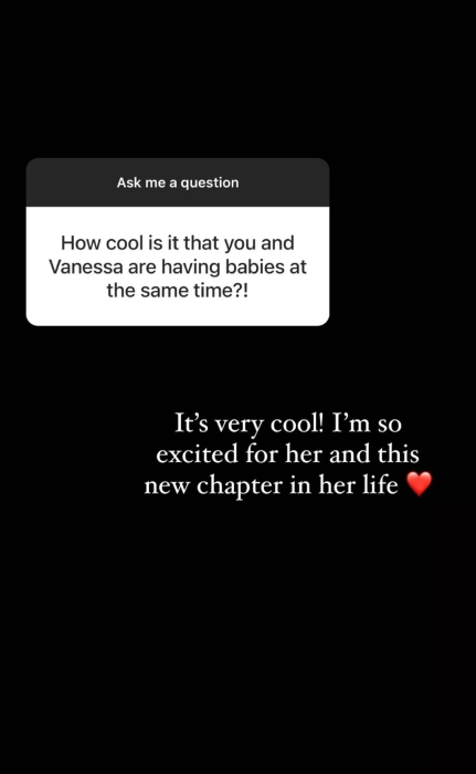 “How cool is it that you and Vanessa are having babies at the same time?!,” the question read to which Tisdale replied, “It’s very cool! I’m so excited for her and this new chapter in her life.”