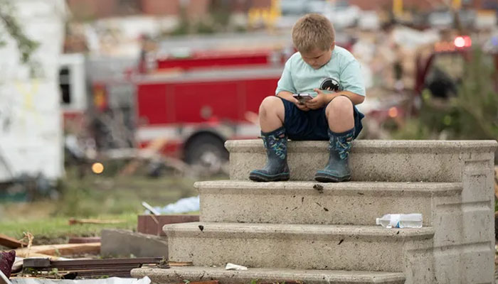 One photo shows six-year-old Hudson Vanatta sitting on the steps of his house that no longer exists, while his father, a firefighter, helped others despite the devastation in their own home.