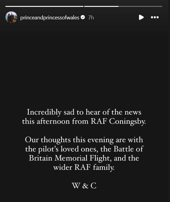 “Incredibly sad to hear the news of this afternoon from RAF Coningby,” the statement the Prince and Princess of Wales read. “Our thoughts this evening are with the pilot’s loved ones, the Battle of Britain Memorial Flight, and the wider RAF family.”