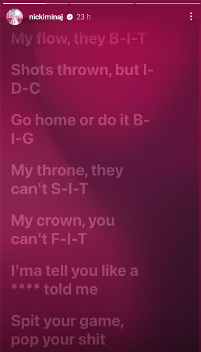 Showing that she means business, Nicki also shared a screenshot of some lyrics from her 2023 song Barbie Dangerous, which declares, “My throne, they can’t S-I-T / My crown, you can’t F-I-T.”