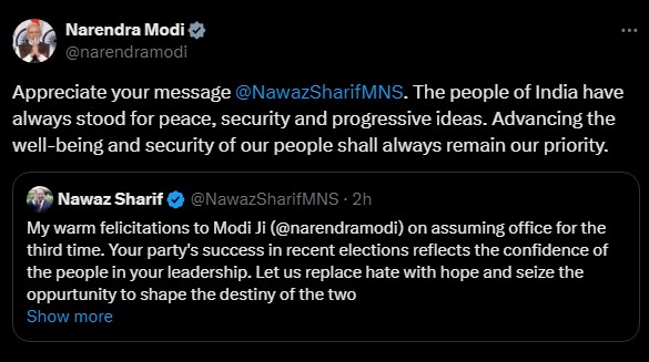 The 73-year-old also responded to the felicitation by former premier Nawaz Sharif. Modi stated on his post on X: "Appreciate your message [Nawaz Sharif]. The people of India have always stood for peace, security and progressive ideas. Advancing the well-being and security of our people shall always remain our priority."