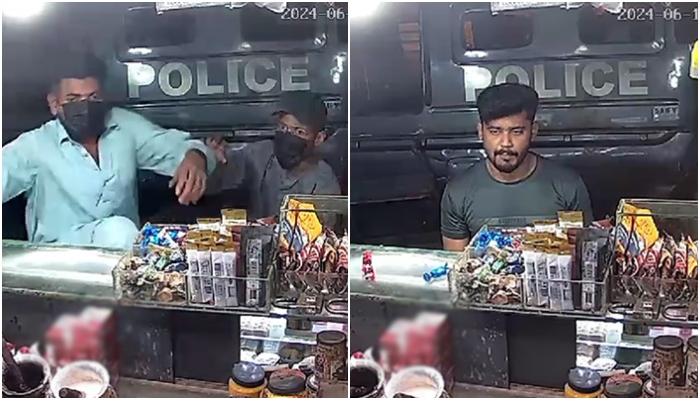 CCTV footage of the incident showed at least three men including two covering their faces with masks came out of a police van and stormed a pan shop. They threatened the shopkeeper and later forcibly jumped into the shop premises to snatch the products and cash.