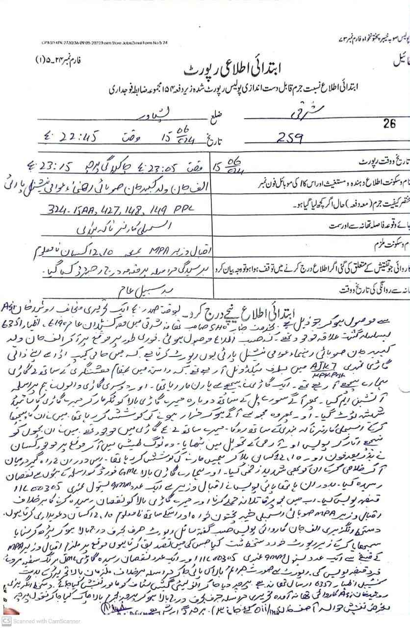 A First Information Report (FIR) has been registered against the PTI-P MPA accusing the lawmaker of attempting to murder the PTI-P leader along with 10 of his accomplices.