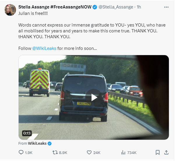 Julian Assange is free, his wife wrote on social media and confirmed that he has left Britain