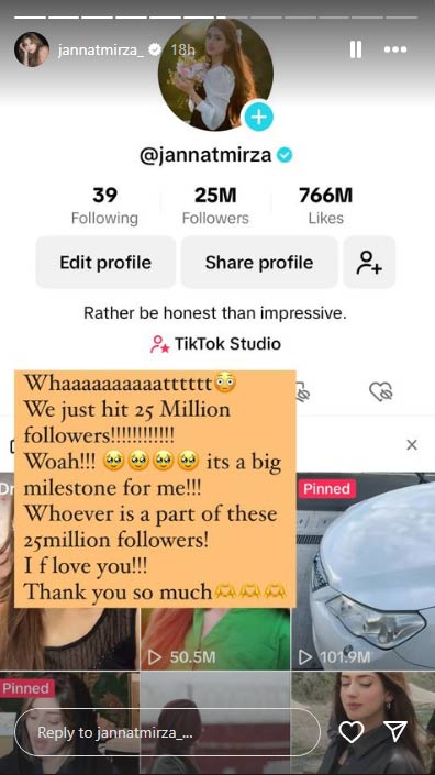 The 26-year-old, who also appeared in a Lollywood movie, shared the achievement with her fans on Instagram by posting a screenshot of her TikTok profile in the IG stories.