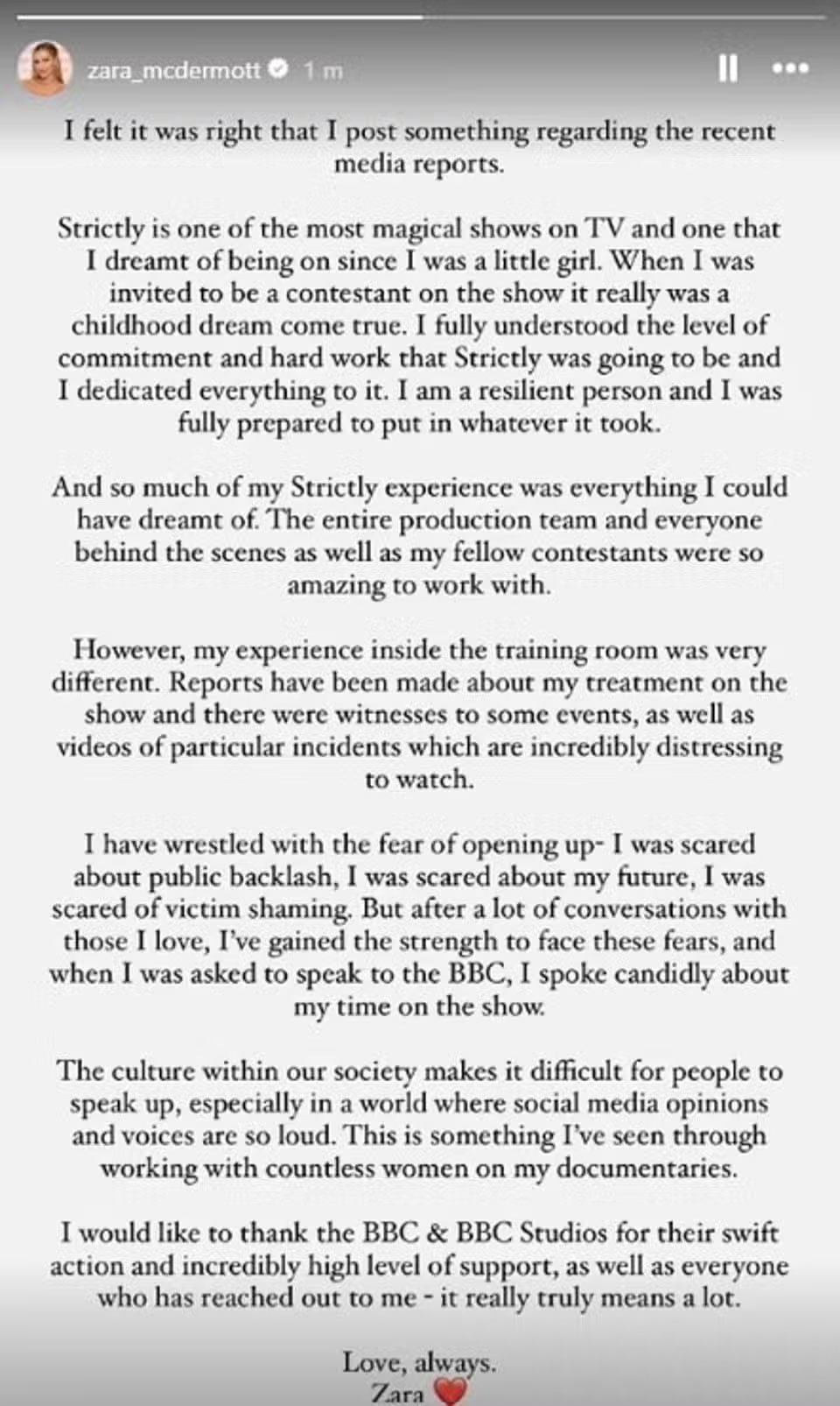 Zara McDermott refers to 'Strictly Come Dancing' as 'everything I could have dreamt of' amid physical abuse