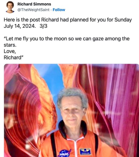 The fitness guru, who rose to fame after starring in the popular series of aerobic videos, Sweatin’ to the Oldies, had saved a post for the upcoming weekend that read, “Let me fly you to the moon so we can gaze among the stars. Love, Richard.”