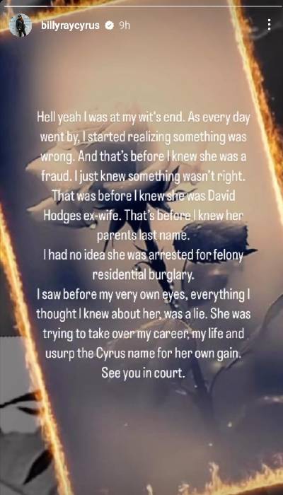 Accompanying a photo of a rose encircled by flames, Cyrus detailed further betrayals, including her arrest for felony residential burglary. “I saw before my very own eyes, everything I thought I knew about her, was a lie,” he wrote. “She was trying to take over my career, my life, and usurp the Cyrus name for her own gain.”