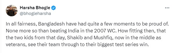 "In all fairness, Bangladesh have had quite a few moments to be proud of. None more so than beating India in the 2007 WC. How fitting then, that the two kids from that day, Shakib and Mushfiq, now in the middle as veterans, see their team through to their biggest test series win," the commentator added while referring to the series outcome.