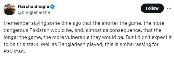 Taking to X, formerly Twitter, Bhogle reflected on the series outcome and said: "Well as Bangladesh played, this is embarrassing for Pakistan."