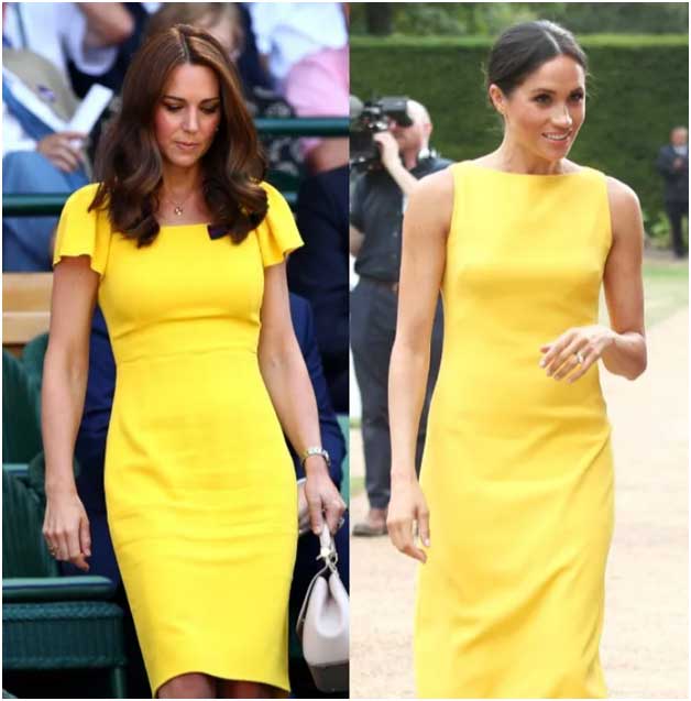 In the picture, Kate is seen wearing a sunny yellow dress at Wimbledon in 2018, while Meghan rocked the matching shade at the "Your Commonwealth" Youth Challenge in July in the same year.