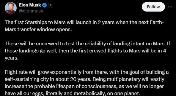 Taking to social media platform X, Musk said: "These will be uncrewed to test the reliability of landing intact on Mars."