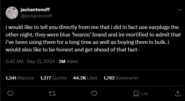 “I would like to tell you directly from me that i did in fact use earplugs the other night,” he penned. “they were blue ‘hearos’ brand and im mortified to admit that i’ve been using them for a long time as well as buying them in bulk.”