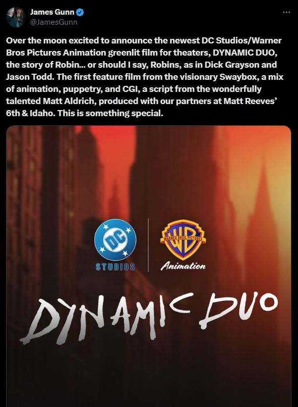 Gunn, taking it to his Twitter handle, wrote: “Over the moon excited to announce the newest DC Studios/Warner Bros Pictures Animation greenlit film for theaters, Dynamic Duo, the story of Robin… or should I say, Robins, as in Dick Grayson and Jason Todd.”
