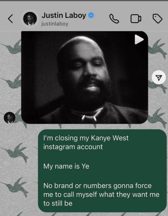 The screenshot read, "I'm closing my Instagram account, my name is Ye. No brand or numbers gonna force me to call myself what they want me to still be."